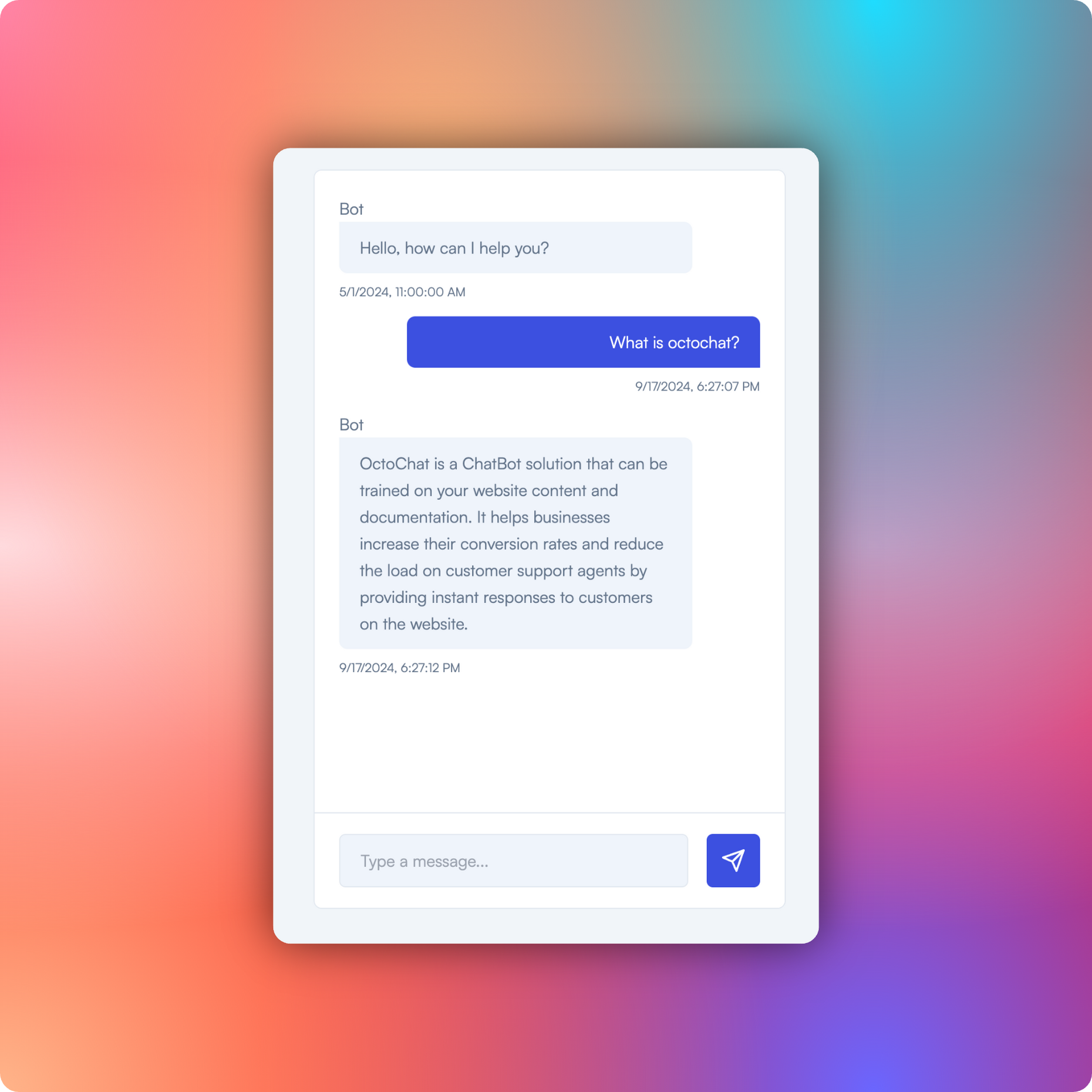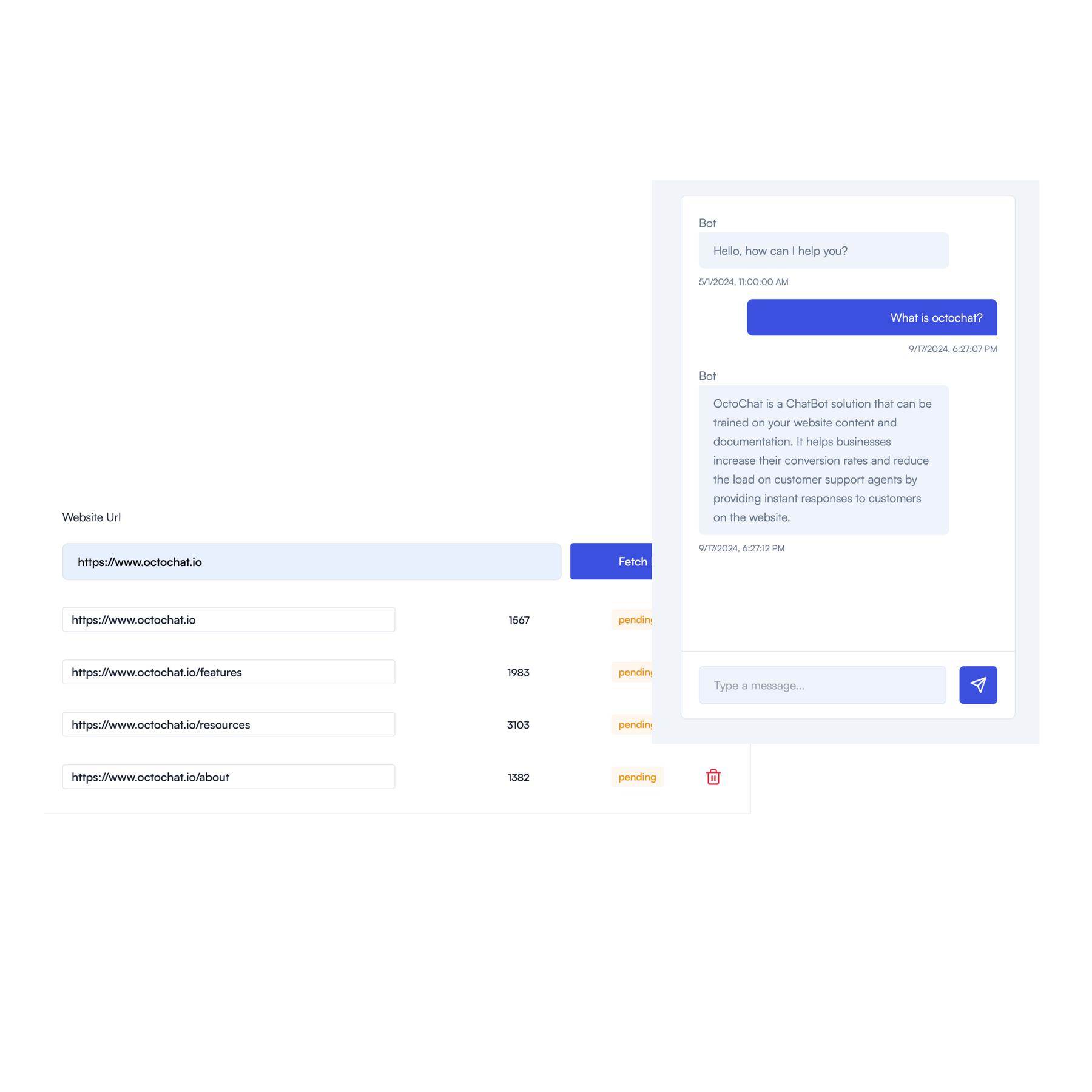 octo is a chatbot that trains on your website, documentation and past customer conversations and starts chatting with your customers immediately.